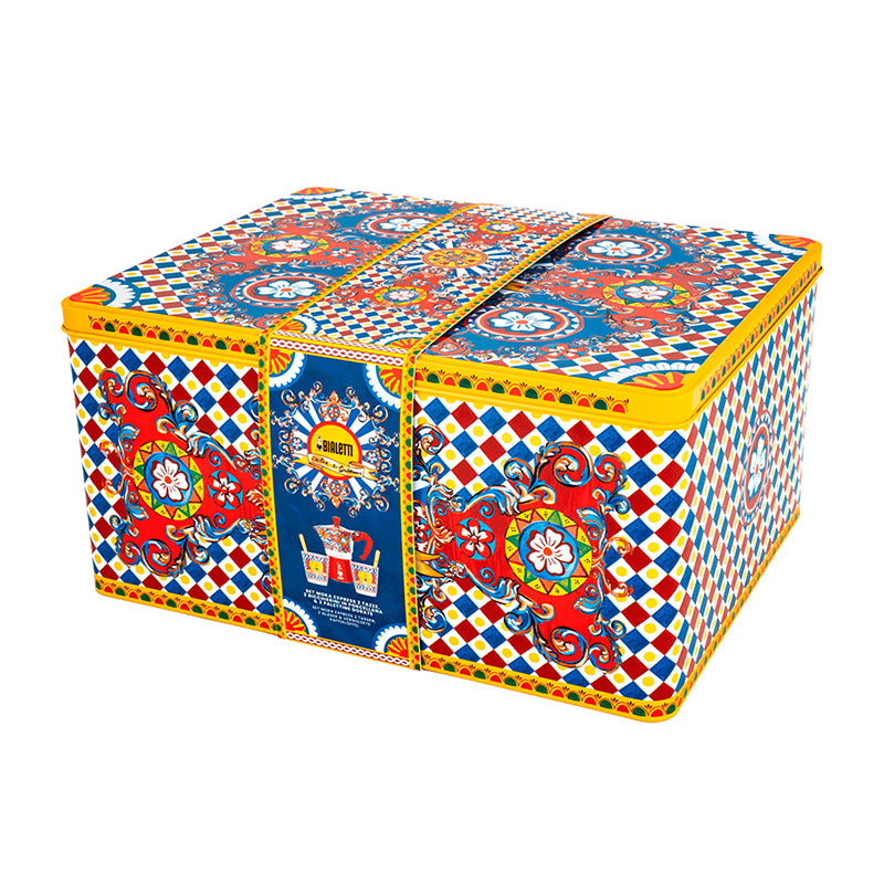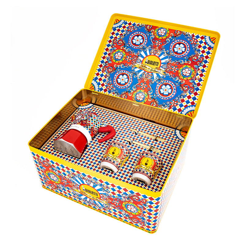 Two icons of Made in Italy come together to celebrate the Italian coffee ritual with the Bialetti Dolce&Gabbana gift set. Inside, you'll find the 2-cup Moka Express Sicilian Cart, two porcelain cups, and two golden stirrers. The set features decorative motifs inspired by the Sicilian Cart, a symbol of island folklore that has long been central to Dolce&Gabbana’s aesthetic. This Bialetti Dolce&Gabbana box is a true masterpiece of style and taste, making it the perfect gift.
