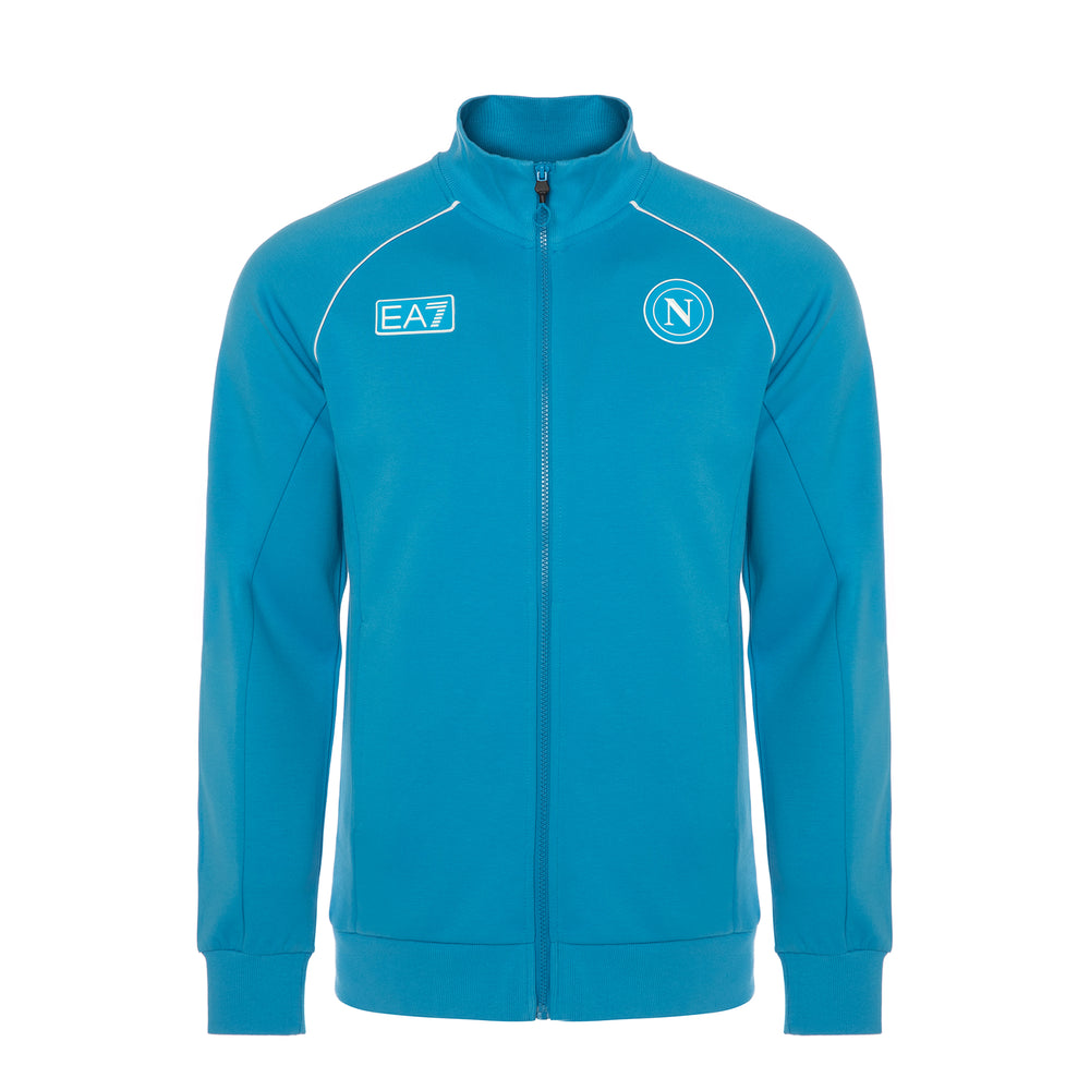 Made in a vibrant Sky Blue, it features a comfortable collar that adds a touch of style and extra protection. On the front, the EA7 and SSC Napoli logos stand out prominently, creating an elegant and distinctive look.