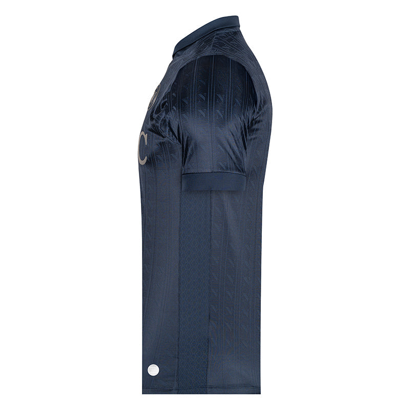 Brand EA7 by Giorgio Armani Group. The dark blue SSC Napoli match jersey for the 2025/2026 season, dedicated to European competition, features an elegant design with refined details.