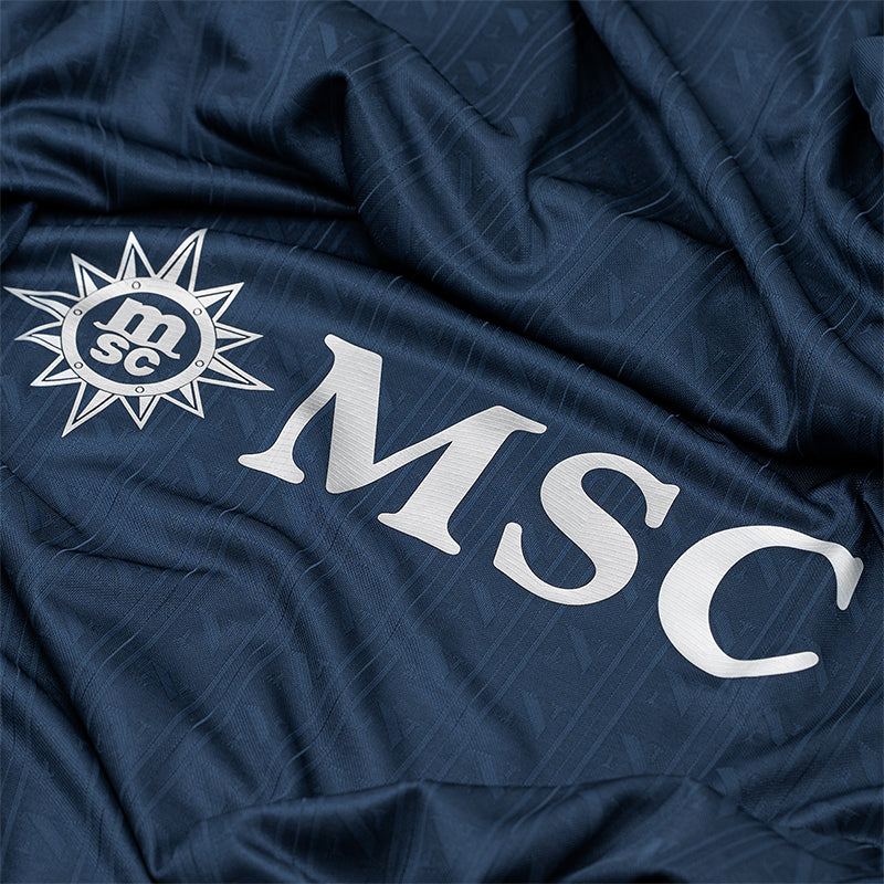 It features a V-shaped collar and silver-finished logos. The sleeves are cut for a snug yet comfortable fit, designed to enhance aerodynamics and ensure freedom of movement. On the back, just below the collar, the silver “SSC Napoli” inscription stands out.
